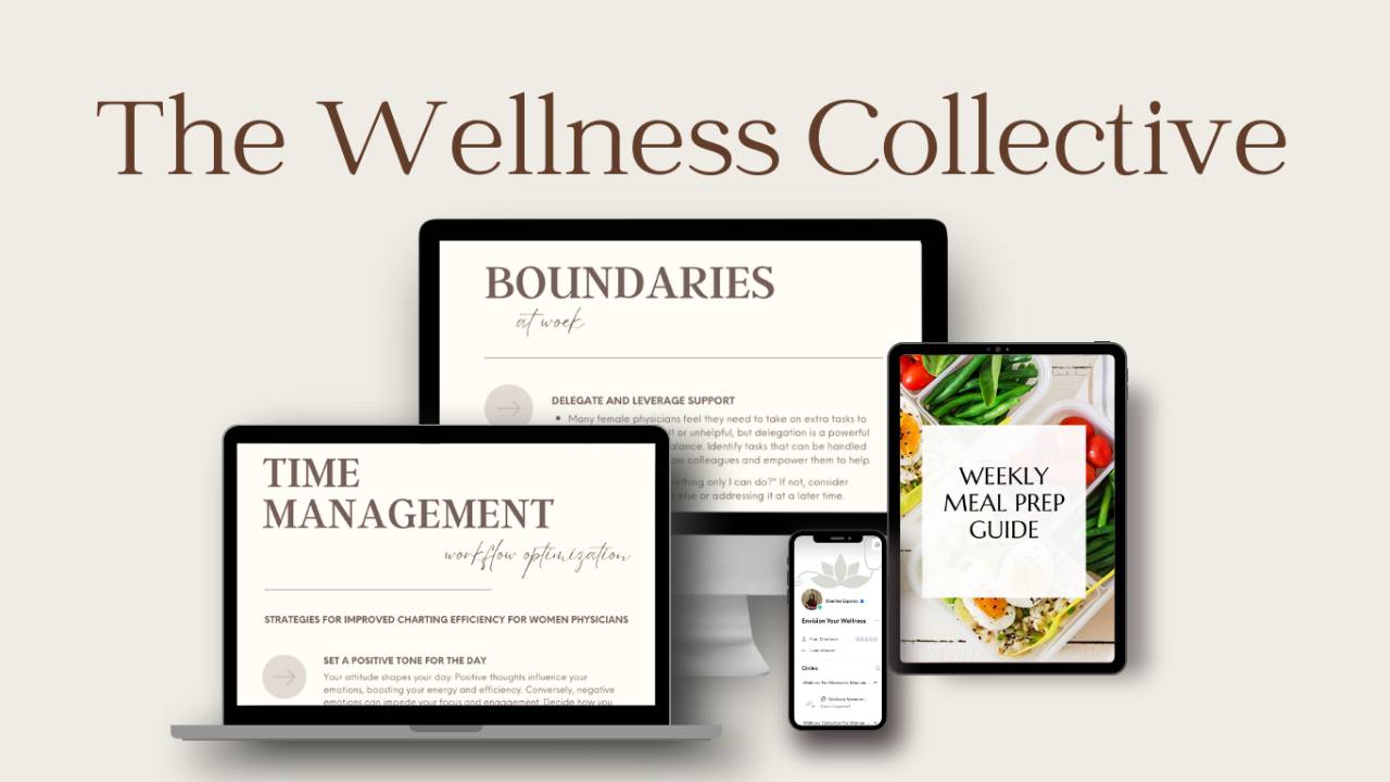 • Wellness Collective Curriculum on Burnout, Imposter syndrome, Nutrition, Movement, Mindset, Time Management, Sleep. You get one module sent to your account each week. Lifetime access as long as you are a member.
