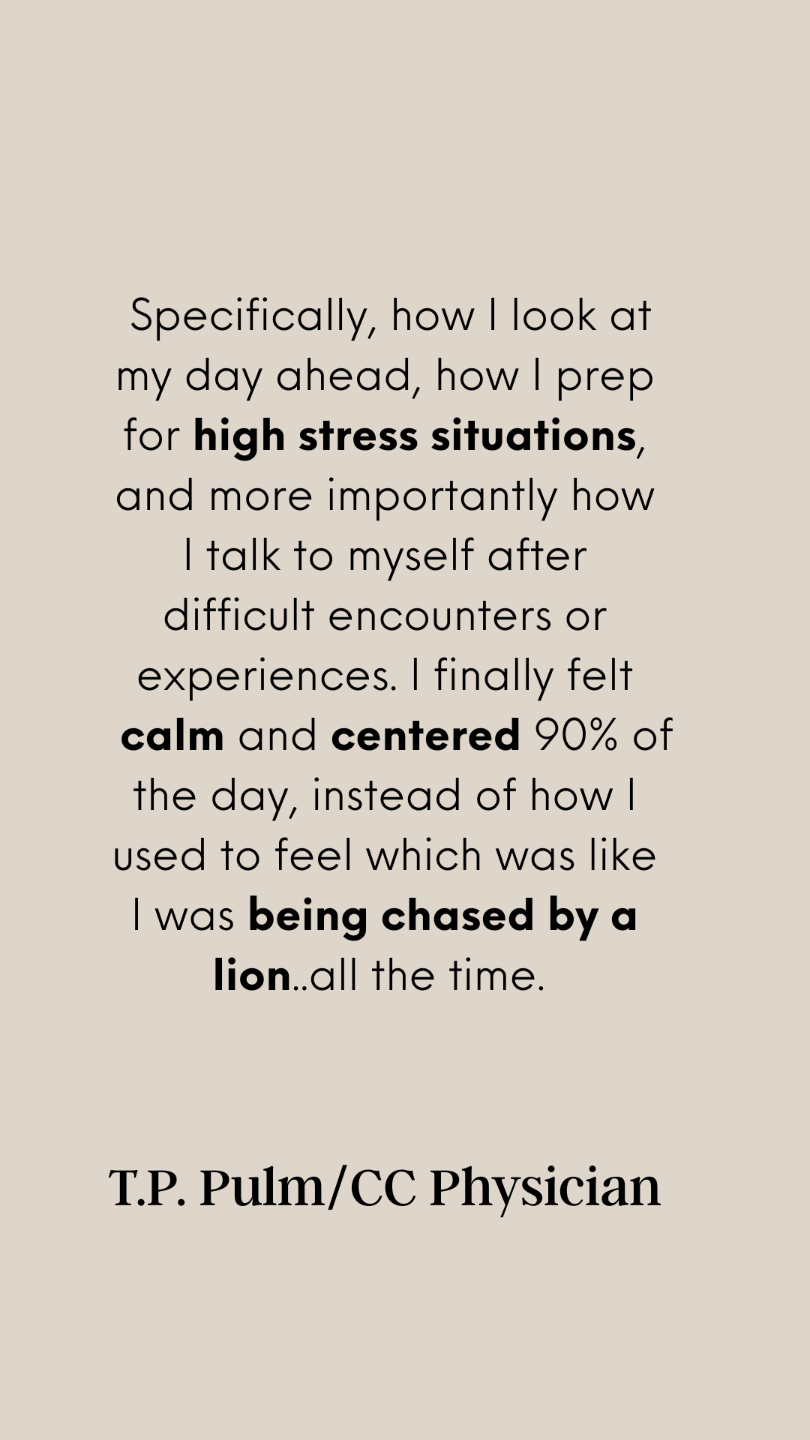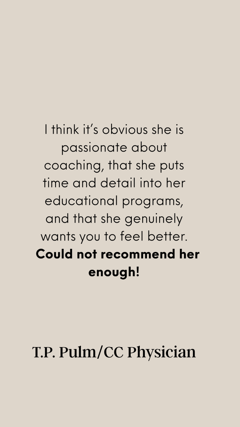 She is very relatable, carries zero judgement on big feelings, & can talk you through the most positive, negative, & regular times through life. She gives you the tools to solve your own problems/concerns in a way that can continue on even after coaching. Recommend 100% especially to professional women who want to feel better in the new year.