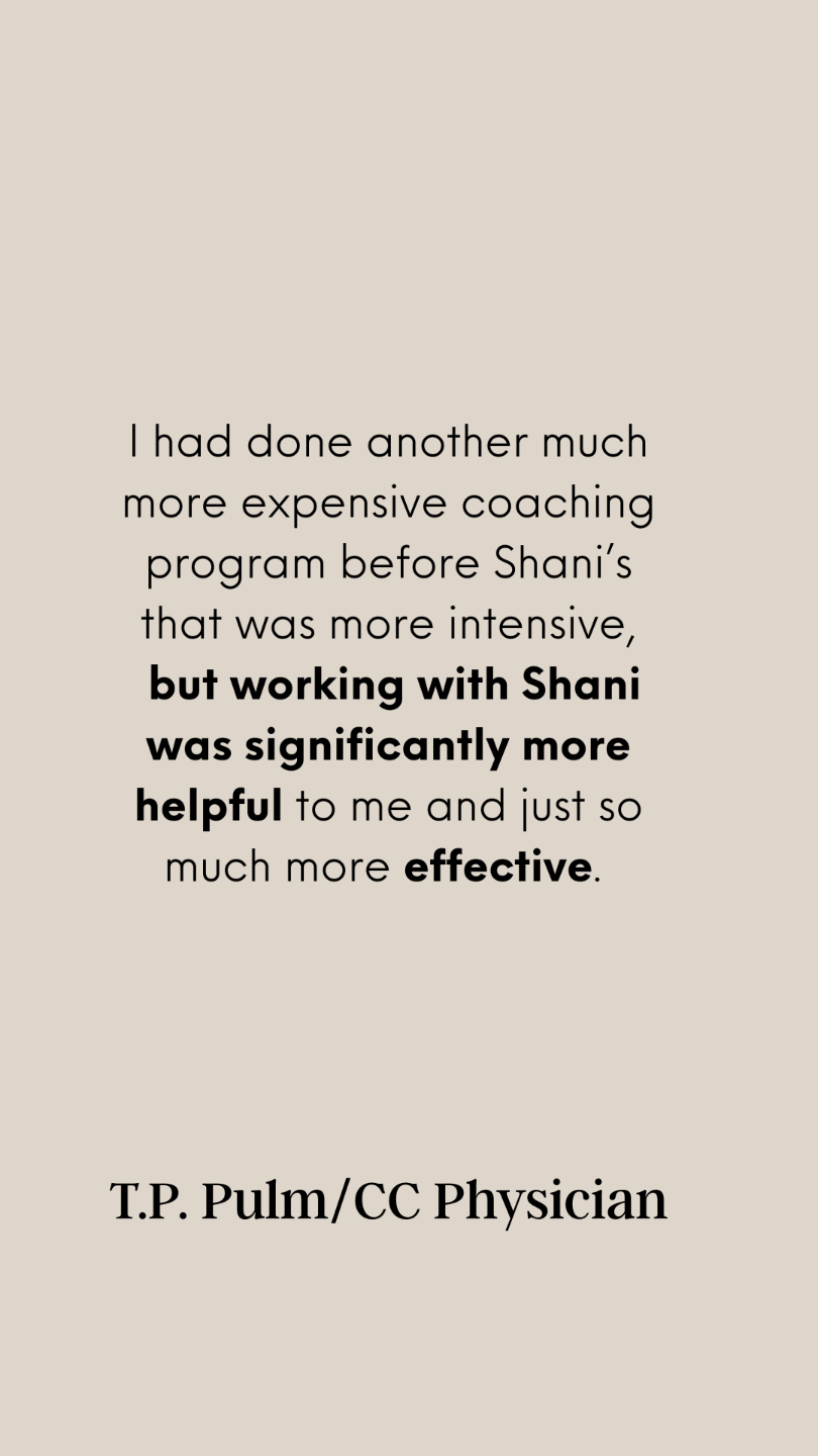 Shani really focused on our own specific goals and working towards each individualized goal instead of trying to coach us into her own template for what works. Some coaching programs want you to follow their template, but that does not work for everyone! She also had us zoom WAY out and look at our long term goals and determine how each small goal can get us there. I also appreciated Shani's relatability. She is not coaching from a pedestal, she is really on our level trying to better herself as well.
