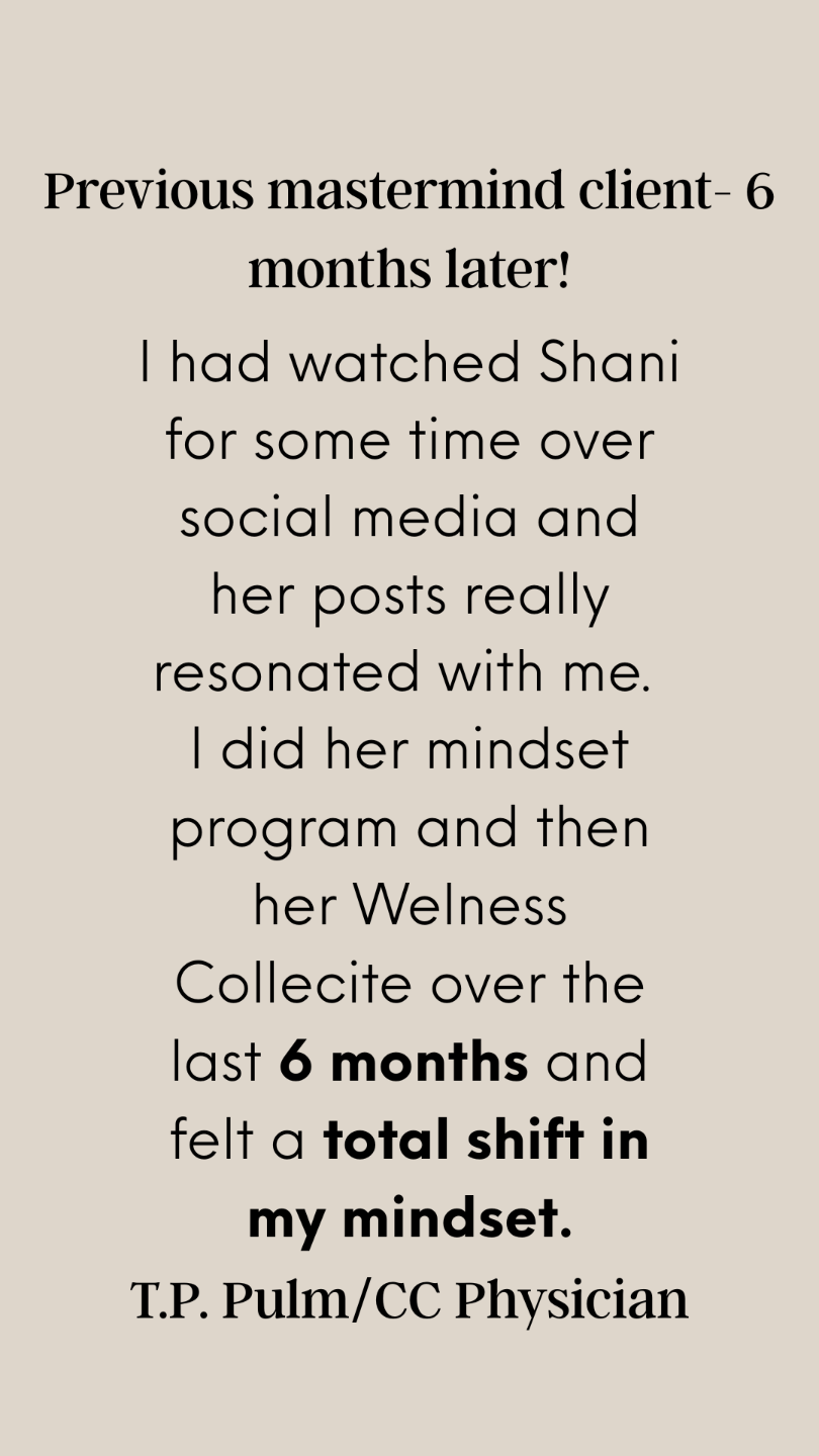 I felt like I am 80% there and just a matter of staying consistent. Shanika gave me an important tool which is to get rid of the self/mom guilt and focusing on the positive (even small) wins. She help me realize the importance of starting with small mind shifts and also to design small measurable goals. By designing small measurable goals, I am setting myself up for success to achieve my larger health goals.